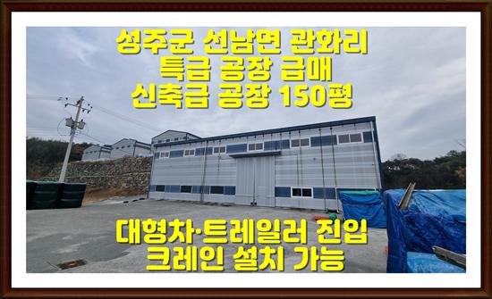 안녕하세요. 성주 대표 부동산 성진부동산 김영찬 소장입니다. 오늘 소개해 드릴 매물은 성주군 선남면 관화리 신축급 공장 으로, 입지·규모·구조 모두 갖춘 희소한 특급 공장 매물입니다. 매물 기본 정보 소재지: 성주군 선남면 관화리 지목: 공장용지 용도지역: 계획관리지역 면적 및 건물 현황 공장 용지 면적: 1,861㎡ (약 563평) ※ 도로 지분 66㎡ 포함 공장 면적: 493㎡ (약 149평) 구조: 일반 철골구조 방향: 동향 (주출입구 기준) 공장 높이: 10.4m