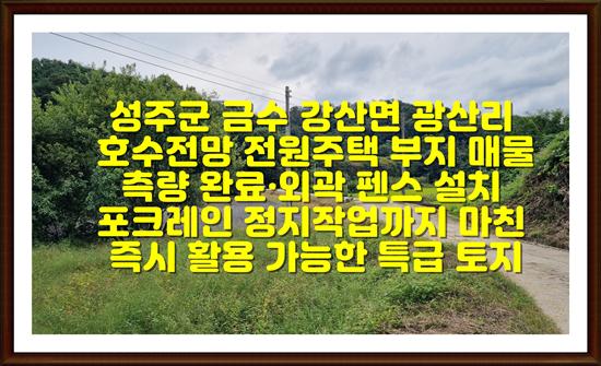 성주군 금수 강산면 광산리 호수전망 전원주택 부지 매물 포스팅 ✅ 소재지: 성주군 금수 강산면 광산리 ✅ 지목: 답 ✅ 지역: 계획관리지역 ✅ 토지면적: 972㎡ (294평) ✅ 매매가: 6,500만 원 ✅ 현황: 벼농사 경작 중, 3m 도로 접함, 남향 매물 ✅ 추가사항: 측량 완료, 외곽 파이프 펜스 설치, 포크레인 작업 완료
